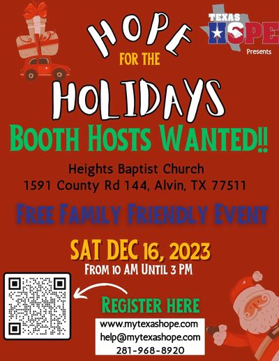 Where: Heights Baptist Church | 1591 County Road 144 | Alvin, TX 77511